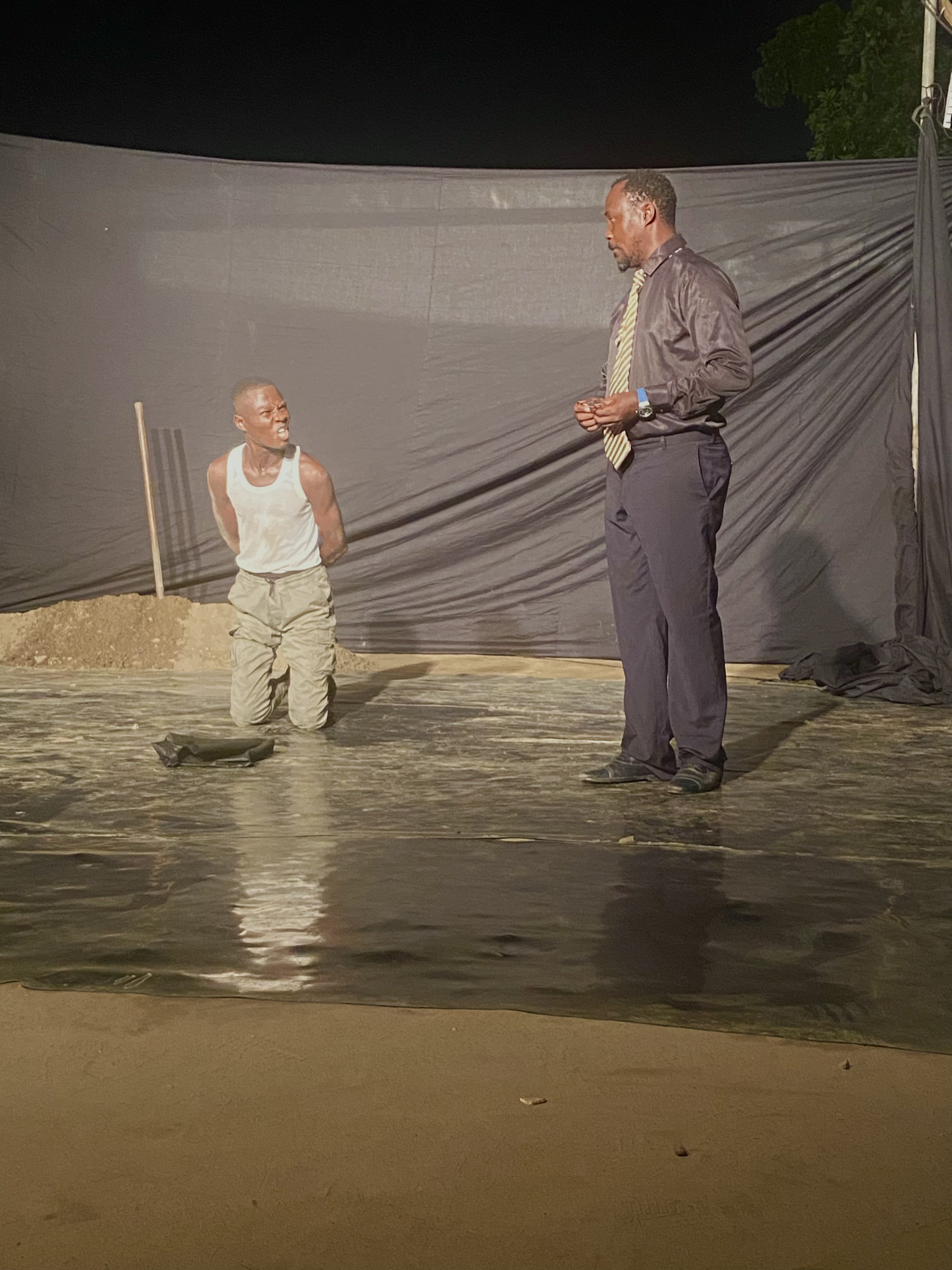 La tombe sacrée a été représentée le 17 décembre 2025 au Centre d’art contemporain des Ateliers Sahm à Brazzaville. L’espace est en plein air.